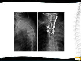 Posterior dekompresyon ve tm rezeksiyonu, gevşemiş T1 vidalarinin çıkartılarak solda C7 pedikül + C6 lat. mass vidası ile revizyonu